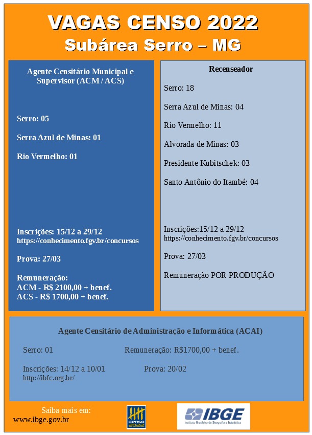 Para o município de Presidente Kubitschek/MG serão ofertadas: 03vagas para Recenseador, que tem como requisito ensino Fundamental completo, com remuneração por produção.