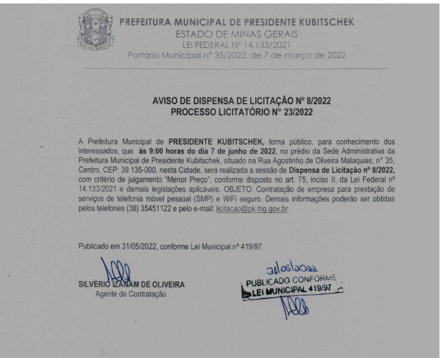AVISO DE DISPENSA DE LICITAÇÃO Nº 8/2022