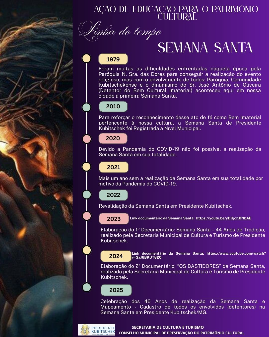 A Semana Santa em Presidente Kubitschek teve início em 1979. Foi reconhecida como Patrimônio Cultural em 2010, quando então foi criado o Fundo Municipal de Preservação do Patrimônio Cultural – FUMPAC, que mediante aprovação do Conselho Municipal de Preservação do Patrimônio Cultural de Presidente Kubitschek, pela Secretaria Municipal de Cultura e Turismo, investe, todos os anos, na recriação desse Bem Imaterial Registrado a Nível Municipal com: manutenção de vestes para os figurantes; manutenção de andores; montagem dos palcos para encenação do Teatro da Última Ceia; pagamento de prestação de serviços de sonorização para a encenação teatral; pagamento de prestação de serviços de cobertura fotográfica e filmagem; aquisição de tintas para dar manutenção nas alabardas e capacetes, entre outras atividades realizadas.