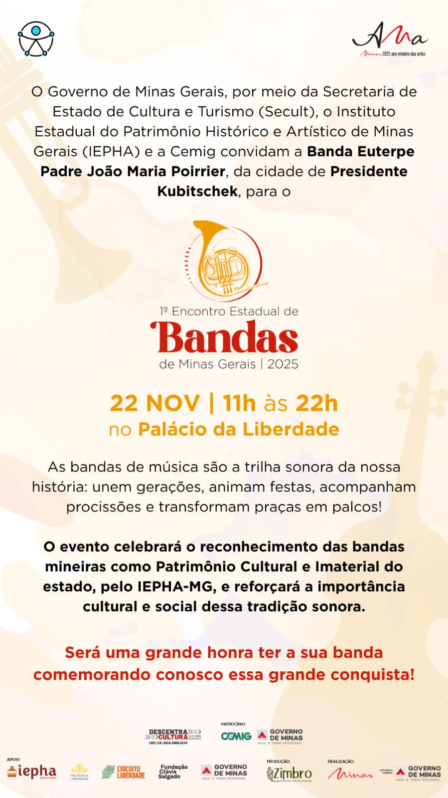 A Secretaria Municipal de Cultura e Turismo de Presidente Kubitschek participou do Cadastro “Bandas de Minas Gerais” e cadastrou a Banda Municipal Euterpe Padre João Maria Poirrier. Os cadastros elaborados pelas cidades mineiras foram analisados e em 2025 foram aprovados. E para formalizar esse momento muito especial e histórico acontecerá em Belo Horizonte, no sábado, dia 22 de novembro de 2025, uma reunião do CONEP – Conselho Estadual de Patrimônio Cultural de Minas Gerais, pela manhã, com o Registro das Bandas de Música e a aprovação desse Registro como Patrimônio Imaterial do Estado de Minas Gerais, pelo IEPHA/MG.