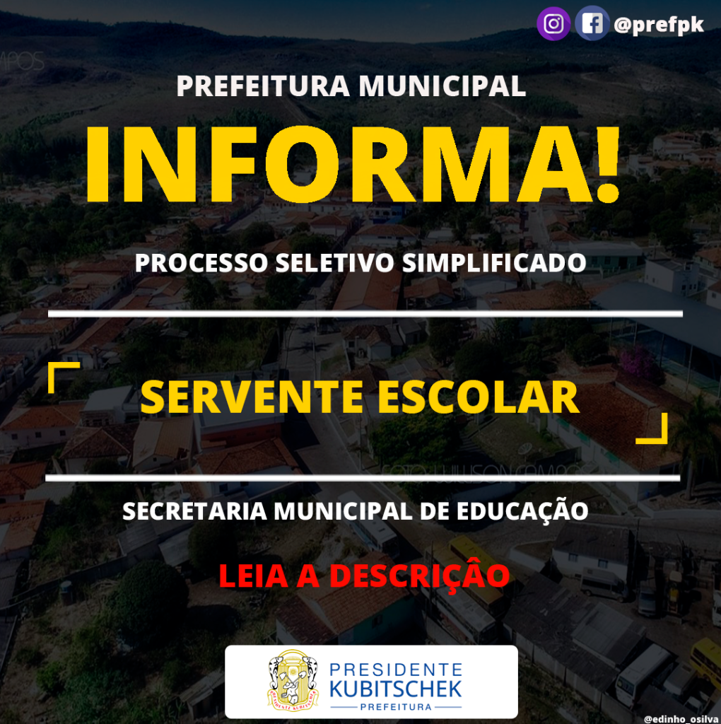 O Prefeito Municipal de Presidente Kubitschek, Estado de Minas Gerais, no uso de suas atribuições legais, torna público a realização de PROCESSO SELETIVO SIMPLIFICADO em caráter de URGÊNCIA e EMERGÊNCIA para contratação temporária das funções abaixo relacionadas, para atuação na Secretaria Municipal de Educação de Presidente Kubitschek ,