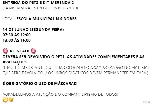 CRONOGRAMA DE ENTREGA DE KIT-JUNINO COMUNIDADES RURAIS DIA: 17/07/2021 Pedimos que nos aguardem nos PONTOS DE COSTUME.. Nós iremos lá para esse momento simples mas muito especial aos nossos Alunos.