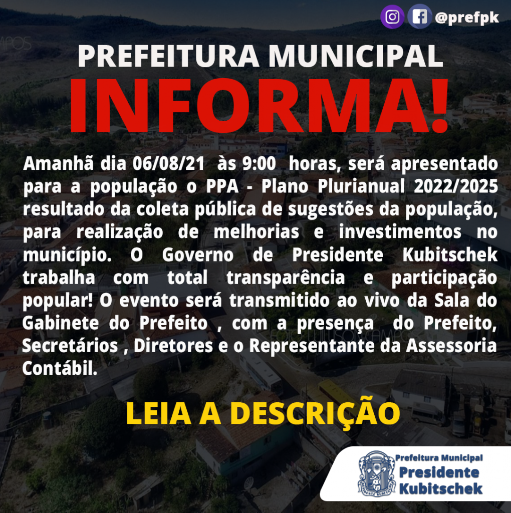 Amanhã dia 06/08/21 às 9:00 horas, será apresentado para a população o PPA – Plano Plurianual 2022/2025 resultado da coleta pública de sugestões da população, para realização de melhorias e investimentos no município. O Governo de Presidente Kubitschek trabalha com total transparência e participação popular! O evento será transmitido ao vivo da Sala do Gabinete do Prefeito , com a presença do Prefeito, Secretários , Diretores e o Representante da Assessoria Contábil.